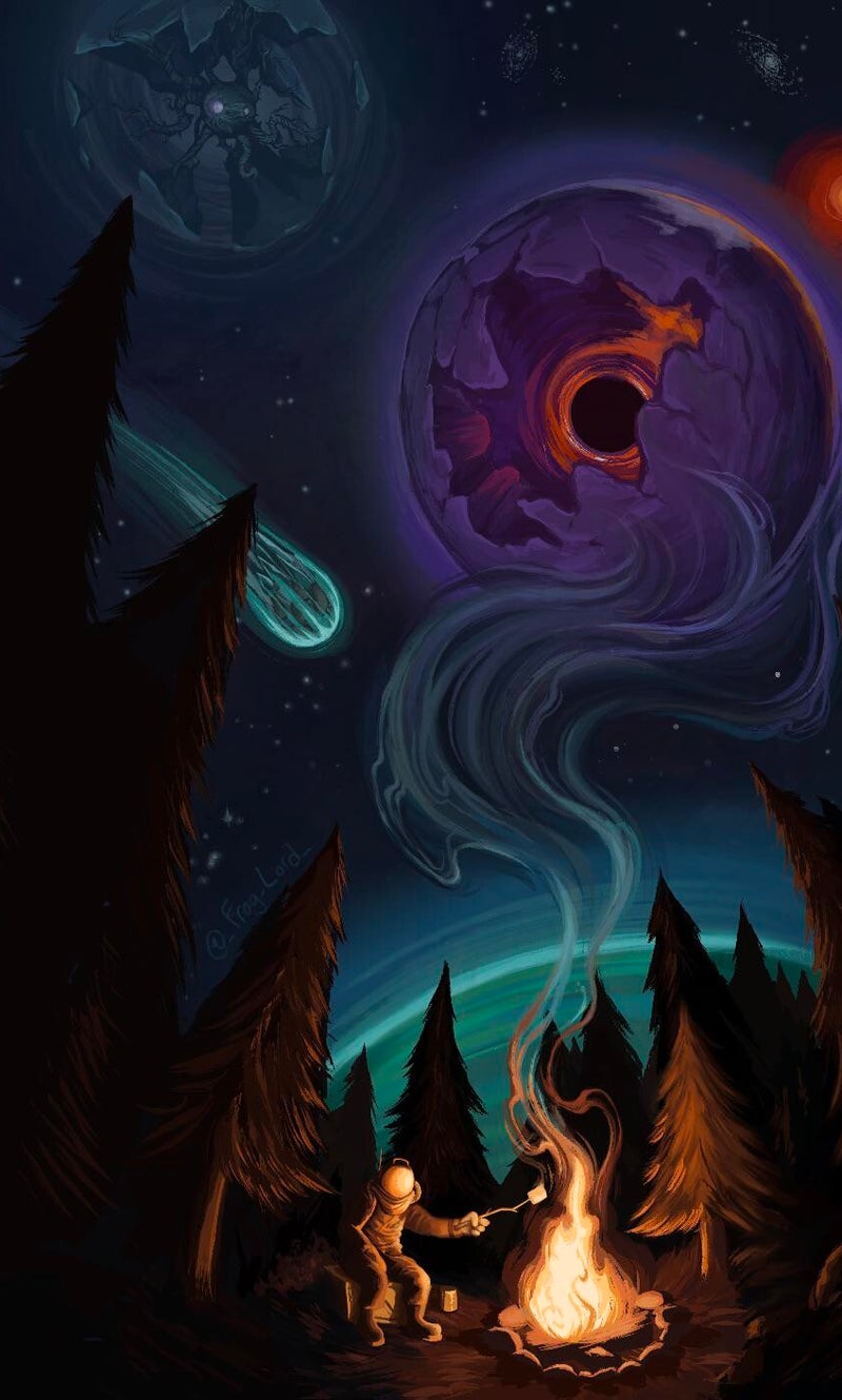 Outer Wilds est un jeu d’exploration spatiale. Et son but ? Eh ben… on n’en sait rien. Parce que quand tu appuies sur start, tu te réveilles sous les étoiles, autour d’un feu de camp qui crépite, et un marshmallow. Et puis, quand tu te renseignes un peu autour de toi, la seule chose que tu apprends, c’est que tu es un petit alien à la peau bleue, que tu es sur ta planète natale, "Atrebois", et que tu es le petit dernier d’une expédition spatiale.