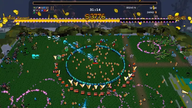 Le concept reste simple et efficace : votre avatar combat automatiquement, et votre objectif principal est de survivre le plus longtemps possible dans des arènes grouillantes d’ennemis. Pendant cette lutte acharnée, vous collectez de l’or et des améliorations pour optimiser vos chances de survie. La vue classique en perspective de dessus a été transformée en voxels tridimensionnels, donnant l’impression d’un plateau vivant devant vos yeux. Le rendu visuel, minimaliste mais élégant, combine modernité et nostalgie. Les personnages 2D en relief apportent une touche rétro particulièrement charmante, le tout sublimé par une ambiance sonore et des musiques inspirées des classiques du rétrogaming. Malgré l’apparente simplicité graphique, cet univers pixelisé regorge de détails soignés pour séduire les amateurs du genre. Pour les passionnés de rétrogaming, cette expérience en Réalité Virtuelle n’est pas une révolution technologique, mais plutôt une réinterprétation réussie, enrichie par des petits effets 3D agréables. Vous pouvez jouer assis ou debout, avec un plateau ajustable selon vos préférences, tout en profitant du contenu riche de Vampire Survivors. En prime, les extensions Legacy of the Moonspell et Tides of the Foscari sont incluses dès le lancement, garantissant une expérience encore plus captivante et complète.