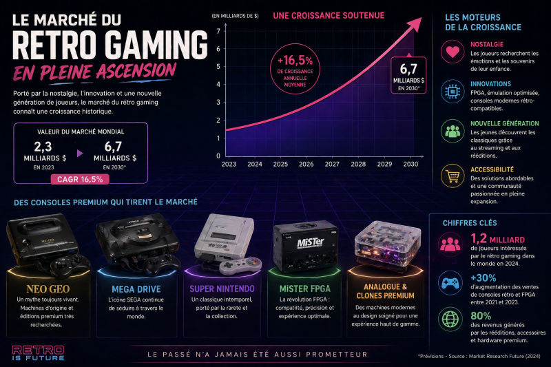 Sources : SEGA – Communiqué officiel (décembre 2023) sur le retour des licences historiques / Video Games Chronicle – Article sur le projet Sega Universe (2026)/ SNK – Annonce officielle de la Neo Geo AES+ /Les Numériques – Analyse du retour de la Neo Geo (2026) / Time Extension – Informations sur la GF1 Neptune / Rom Game – Suivi du projet Neptune FPGA /GamesRadar – Analyse technique FPGA vs émulation / Market Research Future – Données sur la croissance du rétro gaming / The Verge – Retrait des jeux rétro SEGA et stratégie catalogue